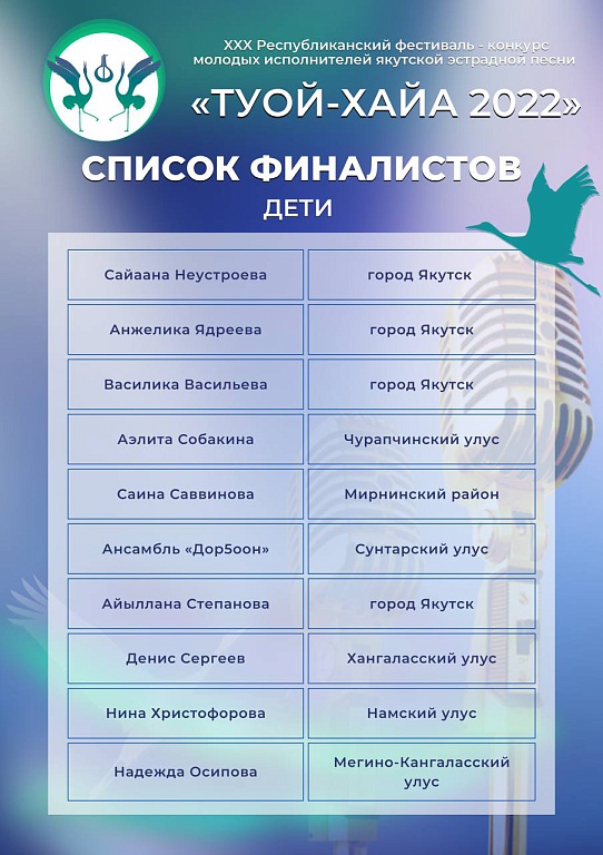 Подведены итоги отборочного тура «ТУОЙ-ХАЙА». В финал прошли 10 конкурсантов. 27-29 мая 2022 они примут участие в ХХХ юбилейном Республиканском фестиваль-конкурсе молодых исполнителей якутской эстрадной песни «ТУОЙ-ХАЙА».