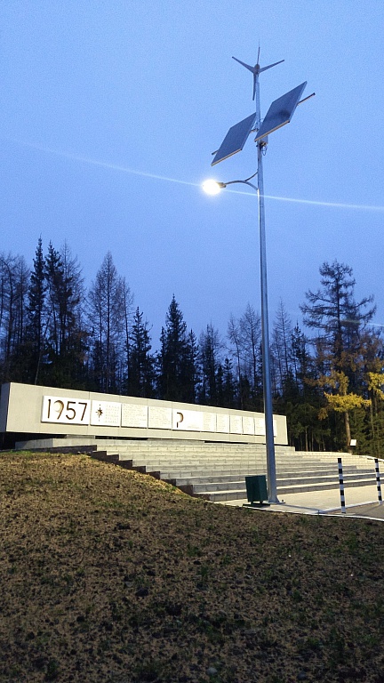 Этим летом на въездном знаке по Ленской трассе – стеле «Мирный» установили светильник, который работает от аккумулятора, заряжающегося при помощи солнечных батарей и ветрогенератора. Еще два таких же комплекта освещают мемориальную доску «Шоферам-первопроходцам», которая находится напротив въездной стелы. Системы полностью автономны и независимы от централизованных сетей электроснабжения.