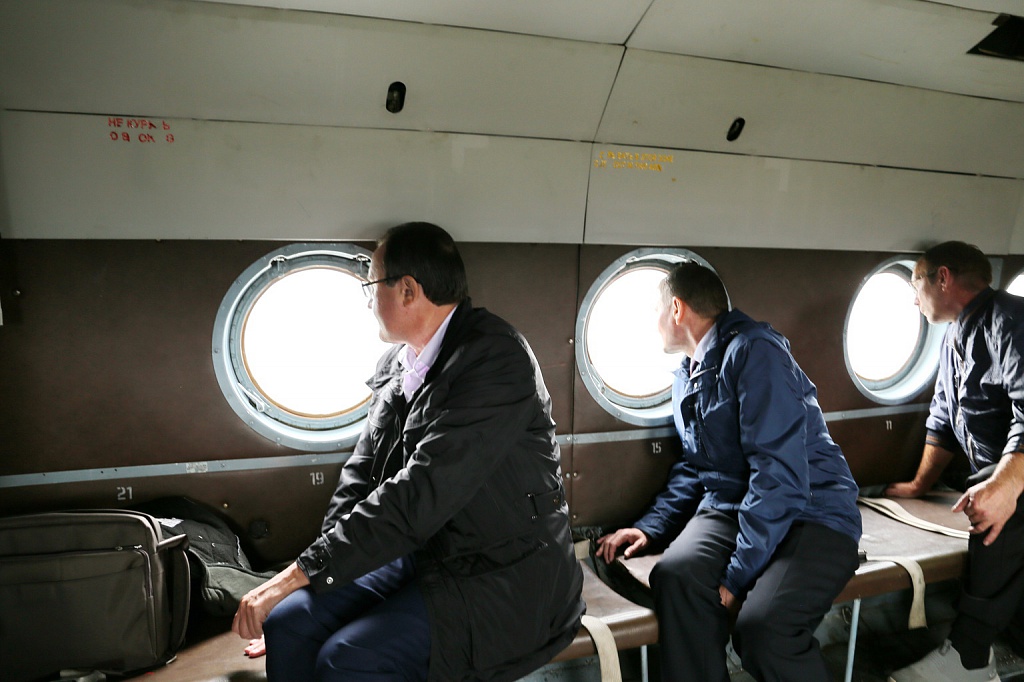 Глава района Ришат Юзмухаметов с сотрудниками Авиалесоохраны на вертолете Ми-8 компании АЛРОСА совершил трехчасовой облет леса для оценки обстановки и распределения сил. По сравнению с 2013 годом, тайга не подверглась сильному выгоранию. Вертолет сел в районе Чернышевска для передачи провизии и получения информации. Посадка рядом с Сюльдюкаром не представилась возможным из-за погоды. Туда провизию доставят на катере.
