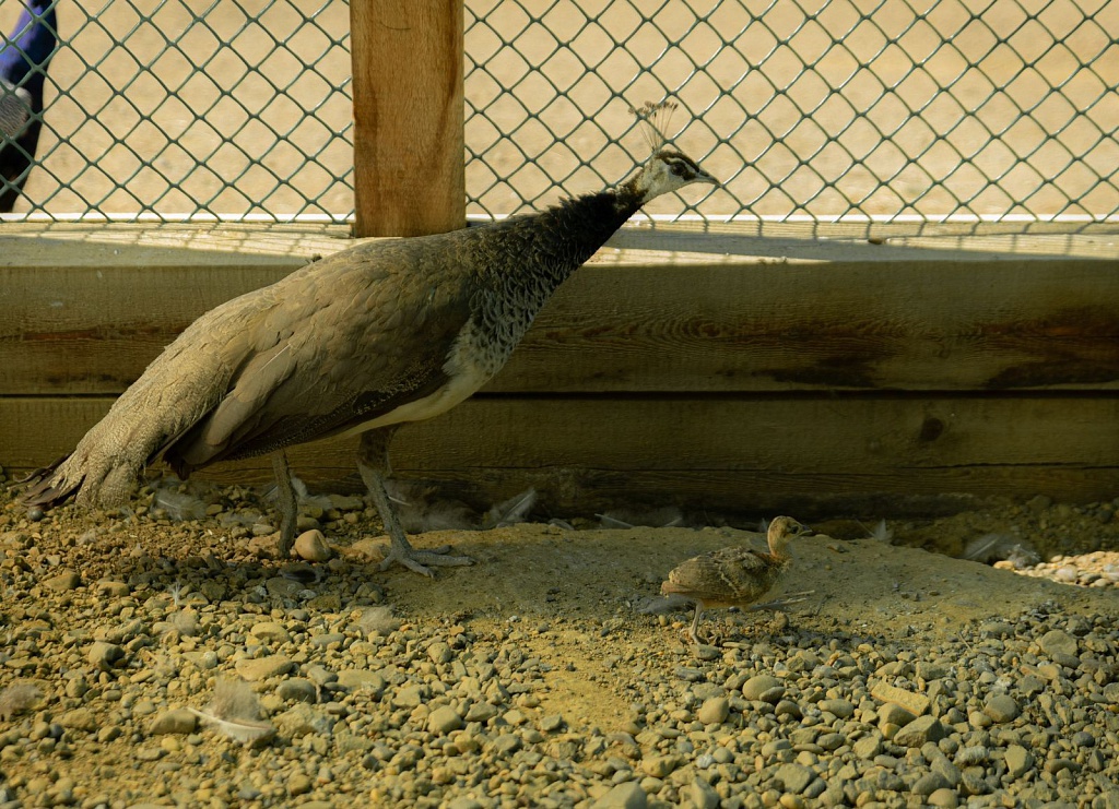 В этом году три павы уходили в лес, и сейчас месячные малыши-павлуши вовсю бегают по вольеру, а заботливые мамочки-павы глаз не сводят с малышей. Сейчас малыши с виду неприглядные, их половая принадлежность тоже не определяется. Но если внимательно присмотреться, то перышки все равно отливают золотисто-зеленым цветом. А узнать, павлины это или павы, специалисты смогут ближе к шести месяцам.