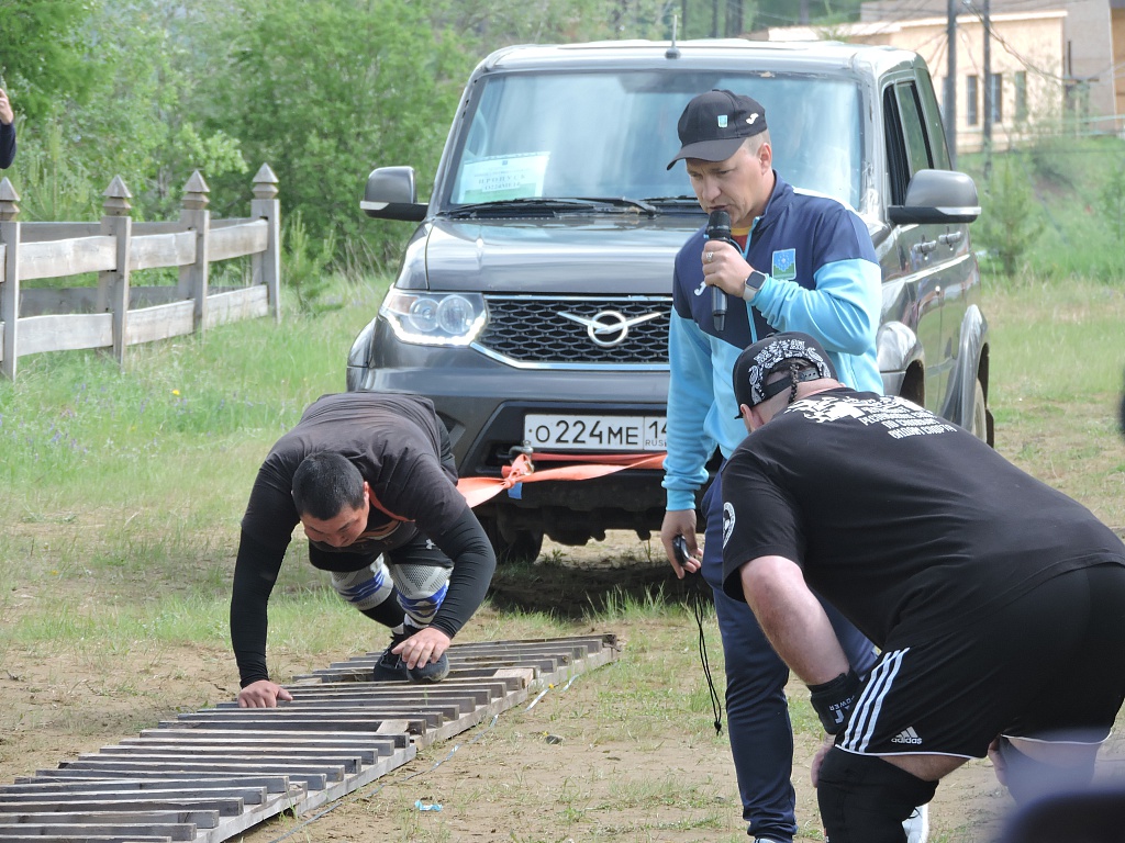 В первом конкурсе, который официально называется «Буксировка саней», нужно было протащить, держась за трос, двухтонный автомобиль. Двигаться нужно было, держась за ступени своеобразной деревянной лестницы длиной 30 м, уложенной на землю. Быстрее всех с заданием справился Виктор Владимиров, вторым стал Юрий Малыгин, третьим – Игорь Матушкин. Очередность участия в первом конкурсе определялась жребием. Но следующий конкурс начинал тот, кто показал в предыдущем худший результат, а завершал победитель первого конкурса.
