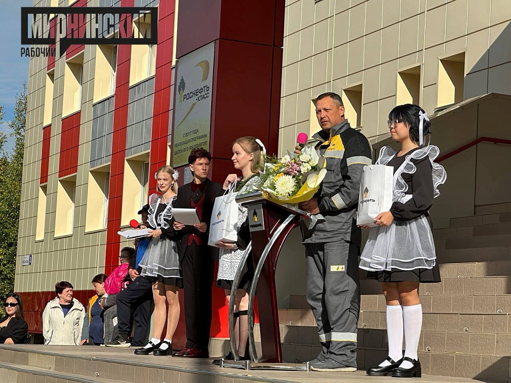 Далее директор школы Надежда Владимировна Истомина поздравила всех с праздником Днем знаний и рассказала об успехах выпускников на государственной итоговой аттестации 2024 года. Три выпускника 9-х классов получили аттестаты особого образца с отличием, 9 выпускников 11 А и Роснефть-класса получили золотые медали 1-й степени за особые успехи в учении, и один ученик получил серебряную медаль 2-й степени.