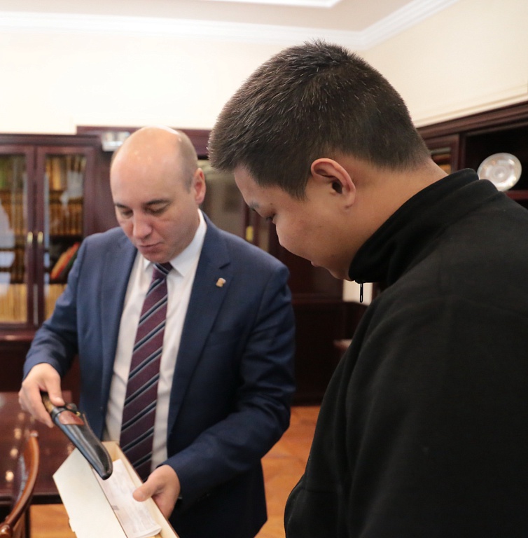 Любую войну именно пехота тянет на своих плечах. Эта мотострелковая бригада воюет под Угледаром, который на днях наши всё-таки взяли. Но несколько месяцев назад парень попал под сброс дрона. «Птичка» вооружена небольшими гранатами от автоматического гранатомета, с самодельным оперением. На 3D-принтере печатают стабилизатор и «на коленке» собирают маленькую бомбу. Она ударилась о кисть, подпрыгнула и взорвалась на уровне лица. После чего последовало длительное восстановление, три госпиталя и текущий отпуск. Вскоре Тимур вернется в часть, где его ждет врачебная комиссия. Он спокойно и кратко отвечает на вопросы Александра Басырова о службе. Встречи с отпускниками очень полезны. За такими краткими рассказами обязательно вырисовывается уровень снабжения, настрой, актуальные потребности. Именно после бесед с солдатами родилась идея снабжать всех наших земляков детекторами «Булат». Тимур с интересом выслушал информацию о приборе. Будь у него такой датчик, глядишь и успел бы уйти от атаки. Теперь у него антидрон будет – перед отъездом боец обязательно посетит наш «волонтерский» склад. Подберут ему там и что-то из специальных приборов, снаряжения. В финале беседы глава Мирнинского района вручил солдату традиционный якутский клинок с памятной надписью.