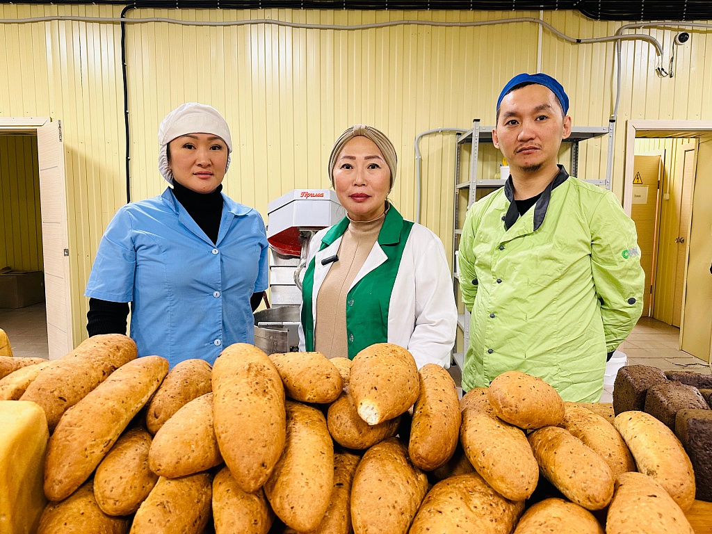 На фото: заведующая производством Мария Сироджова, директор ГК «Татыйыына» Туяра Брызгалова, старший пекарь-кондитер Арылхан Герасимов