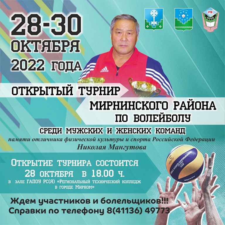 В Мирном с 28 по 30 октября пройдет открытый турнир Мирнинского района по волейболу среди мужских и женских команд. Соревнования посвящены памяти отличника физической культуры и спорта Российской Федерации Николая Мангутова.