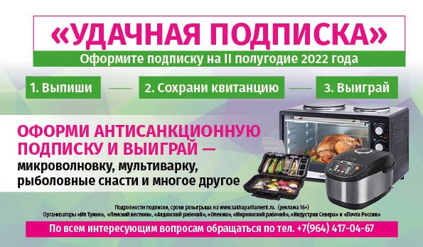 Мы рады сообщить вам, что редакция организовывает розыгрыш призов «УДАЧНАЯ ПОДПИСКА». Его участником может стать каждый, кто оформит подписку на любую районную газету («Ленский вестник», «Алданский рабочий», «Олекма», «Мирнинский рабочий», «Индустрия Севера»), а также «Ил Тумэн» (русское издание. индекс П6253) на второе полугодие 2022 года.