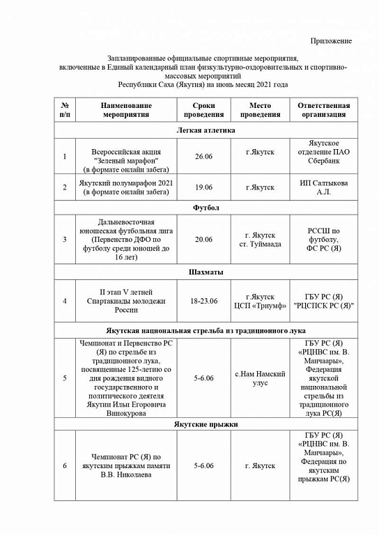 Также в приказе изданы рекомендации о приостановлении всех спортивных мероприятий в июне для глав МО Якутии.