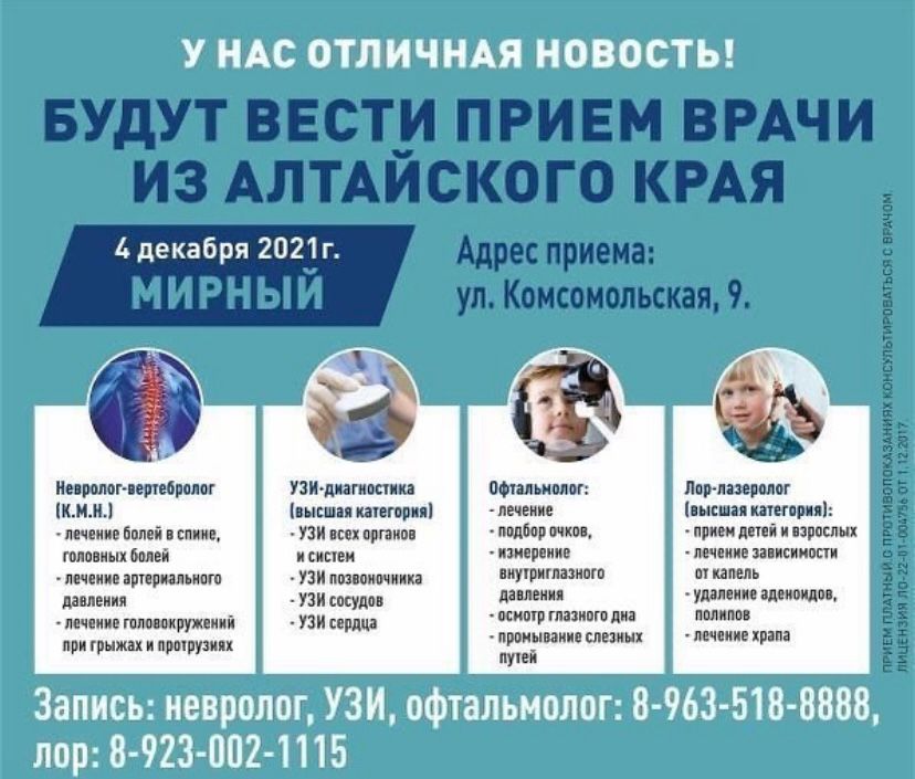 4 декабря 2021г. будут принимать врачи из Алтайской края по ул. Комсомольская 9.